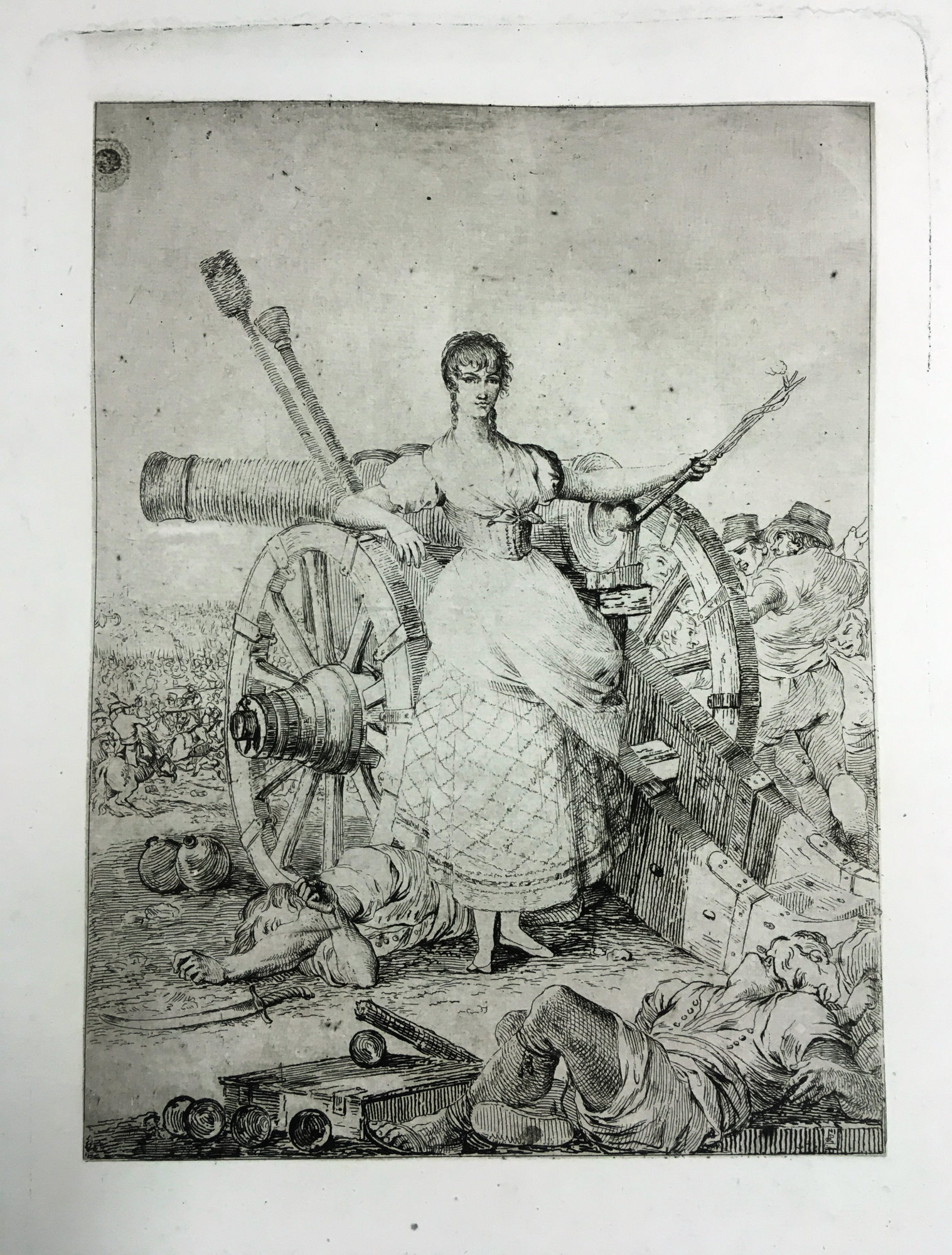 Esta interesante estampa pertenece a una lámina desechada –no se incluyó en el conjunto– y está sin terminar, falta el aguatinta, así como el título y nombre de los autores, incorporados en la serie mediante la técnica de la punta seca. Agustina aparece representada en actitud muy semejante a la de la pintura (fig. 1). Como se ha comentado, los autores prefirieron incluir en la serie de estampas la imagen de Agustina disparando un cañón, más guerrera y convincente para su papel de heroína (fig. 3).