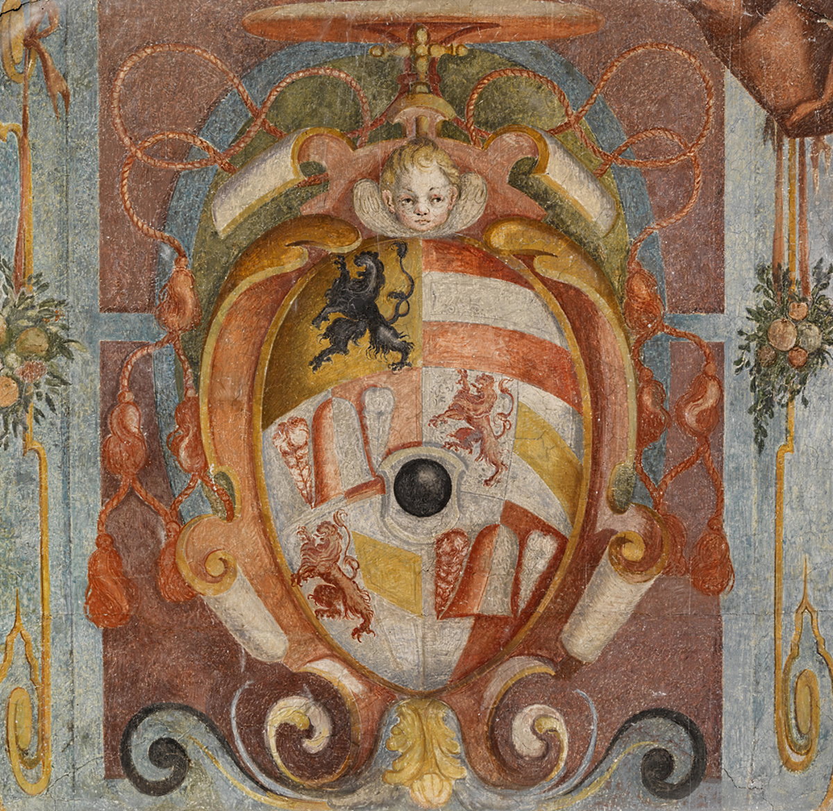 San Virgilio fue obispo de Salzburgo y constructor de su catedral en honor de San Ruperto. Ambos santos flanquean el escudo de armas utilizado por Wolf Dietrich von Raitenau a partir de 1592, momento en el que unió a las armas de la familia Raitenau –bola negra– y de la ciudad de Salzburgo –león rampante y a su derecha tres franjas horizontales de igual tamaño– las armas de las familias Mayer y Schenzer y en el timbre la cruz y el capelo arzobispal.