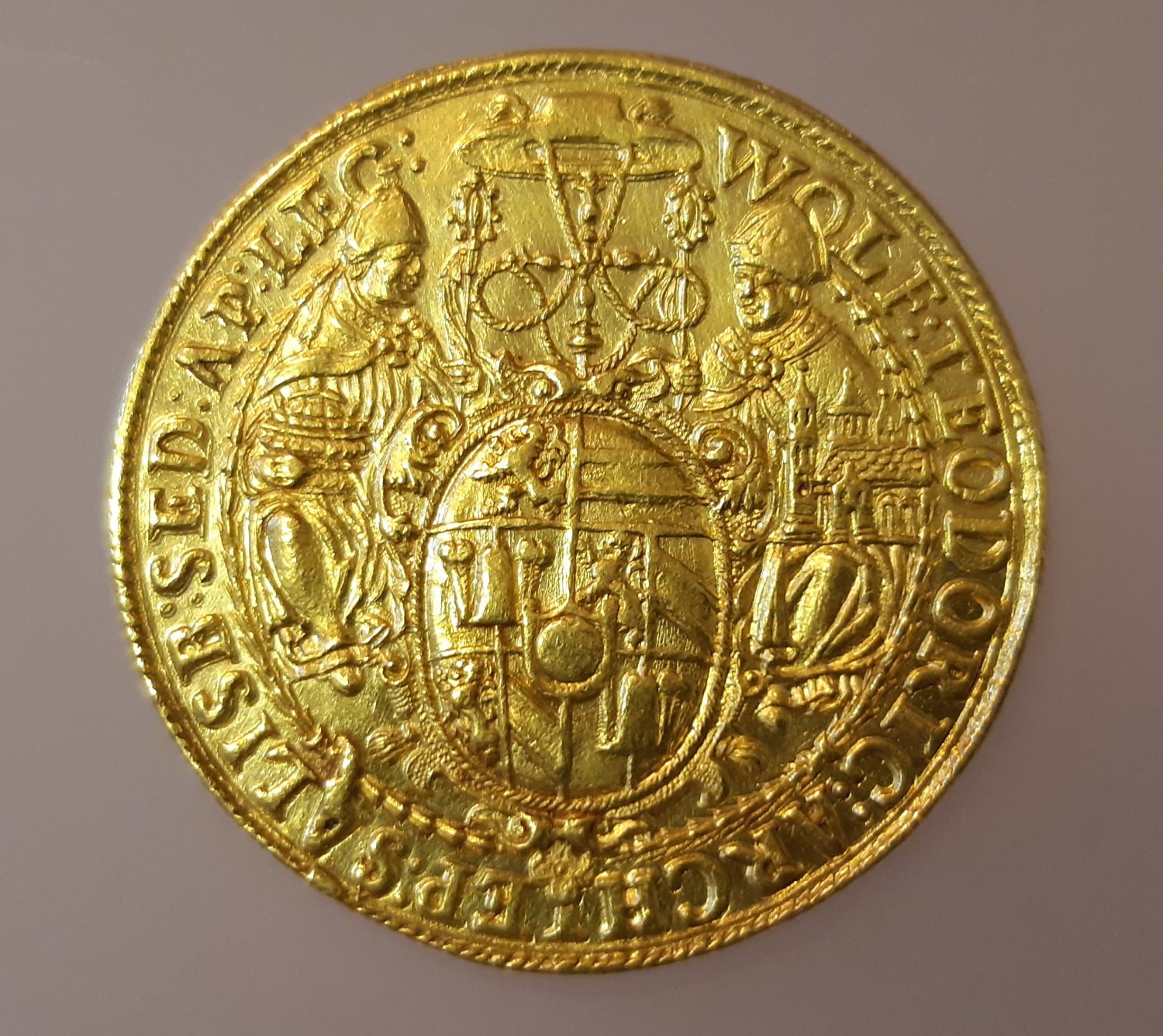 Entre los derechos de los príncipes-arzobispos de Salzburgo figuraba el de acuñar moneda. En la colección numismática del Museo Lázaro Galdiano se conservan dos emitidas por Wolf Dietrich von Raitenau. Ambas presentan una excepcional ejecución y son un claro ejemplo de la afinidad de Raitenau hacia las Bellas Artes.