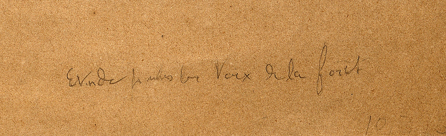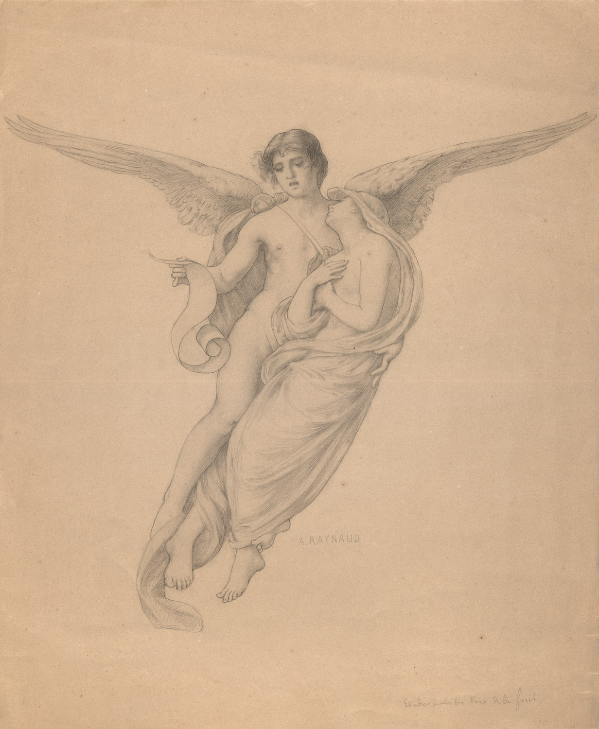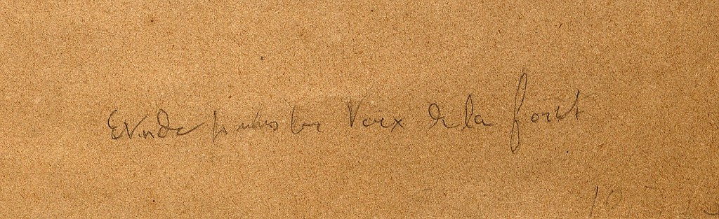 A la derecha, junto a los pies de las figuras, se encuentra la firma manuscrita a lápiz del autor “A. RAYNAUD”. En la esquina inferior derecha, hay una segunda inscripción a lápiz (“Etude ¿figures? La Voix de la forêt”), que ha resultado clave para la identificación de esta obra entre la abundante y dispersa producción del artista (fig. 2).