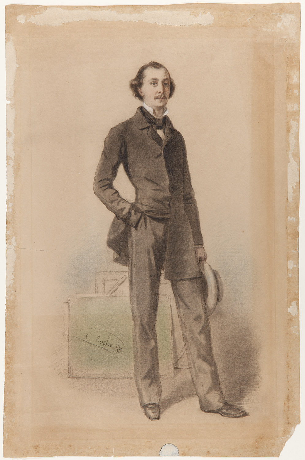 El dibujo representa al pintor de cuerpo entero, con elegante levita y un sombrero claro en la mano izquierda. La derecha, en gesto desenfadado, dentro del bolsillo del pantalón (fig. 2). Detrás de él, se ve una carpeta de dibujos y un bastidor, que podría indicar que Lucas posó en el estudio parisino de Alexandre Marie Roche (París, 1823-1878), o simplemente atributos para indicar la profesión del retratado. El artista francés firmó y dató el dibujo, sobre la carpeta verde del fondo, según su fórmula más habitual “A. Roche. 52” (fig. 3).
