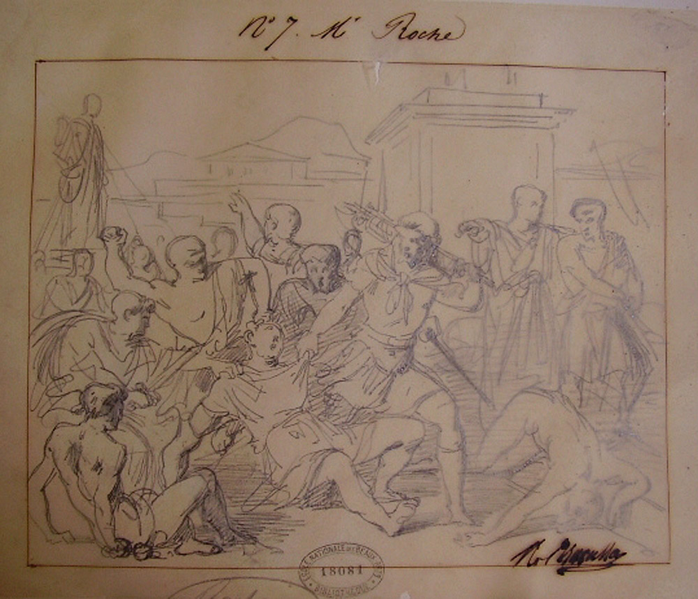 Alexandre Marie Roche (París, el 14 de febrero de 1823 – 1878). Discípulo de François-Édouard Picot, fue pintor de historia y de género, además de retratista. Expuso en el Salón de París desde 1845 hasta 1870, obteniendo una medalla de tercera clase por un retrato presentado en la edición de 1849. En el Musée Vivant Denon de Châlon-sur-Saône se conserva una pintura con un desnudo femenino. El Musée de l’Ecole nationale supérieure des Beaux-Arts de París tiene entre sus fondos La muerte de Vitelio, un trabajo presentado por Roche en 1847 para el Premio de Roma de Pintura, del que también se conserva un dibujo preparatorio (figs. 5 y 6). En 2018 se subastó un retrato masculino de un estilo y técnica muy semejantes al retrato de Lucas (fig. 7).