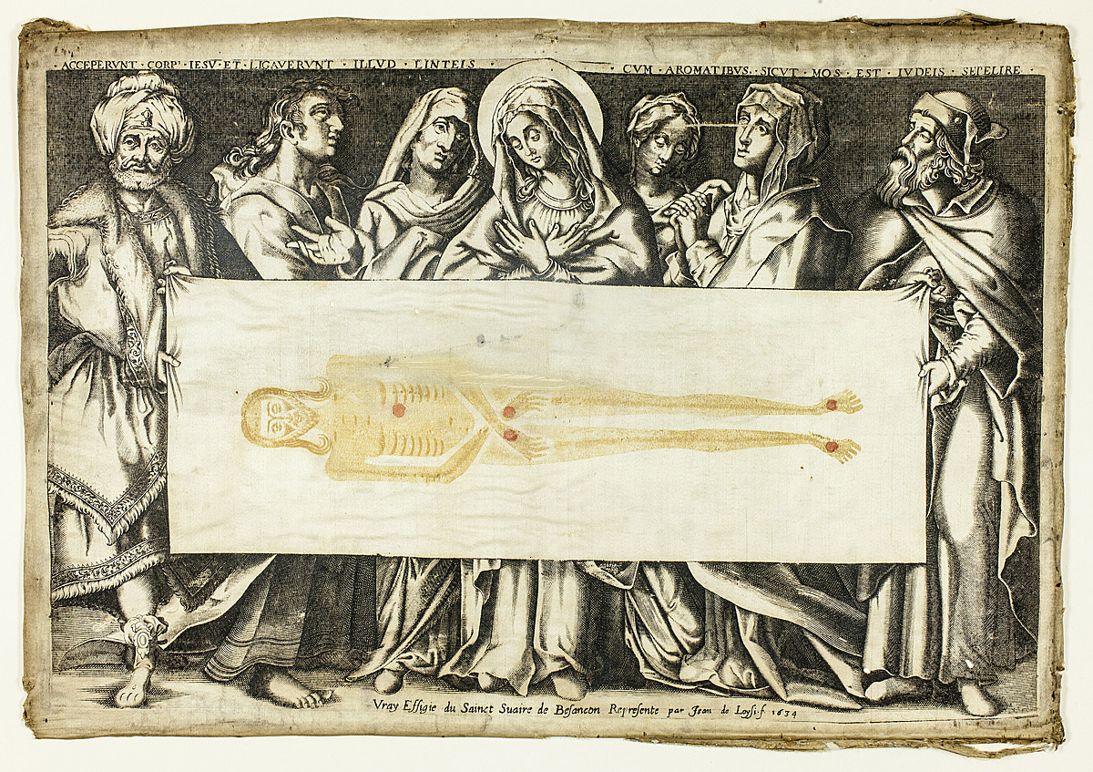Entre los numerosos grabados que se hicieron del sudario destaca el que hizo en 1634 Jean de Loisy (Besançon, 1603-después de 1660), estampado en seda (fig. 6). Jean, hermano mayor de Pierre, utilizó dos tintas: el negro habitual para las figuras y fondo y el ocre para el cuerpo de Cristo, logrando así una mayor verosimilitud y cercanía respecto al original, efecto reforzado en aquellos ejemplares estampados en seda, dado que la reliquia original también era un tejido, aunque de lino. La incorporación a mano de las manchas de sangre en pies, manos y costado, contribuía a una mayor veracidad a un objeto destinado al peregrino más pudiente. En 1658 Pierre de Loisy (Besançon, 1619-1670) recibió el privilegio de producir al menos dos grabados de tamaño inferior, además de otras versiones mayores a partir de 1669. En todas ellas siguió el tipo de composición y técnica de su hermano mayor aunque cambiando o reduciendo el número de personajes, además de incluir dos cartuchos con los textos transcritos arriba. Pierre de Loisy (llamado el joven) era hijo del grabador y maestro orfebre Pierre de Loisy “el viejo” (1557-1640). Fue un reconocido grabador de monedas y estampas calcográficas, maestro de la ceca municipal de Besançon entre 1655 a 1667.