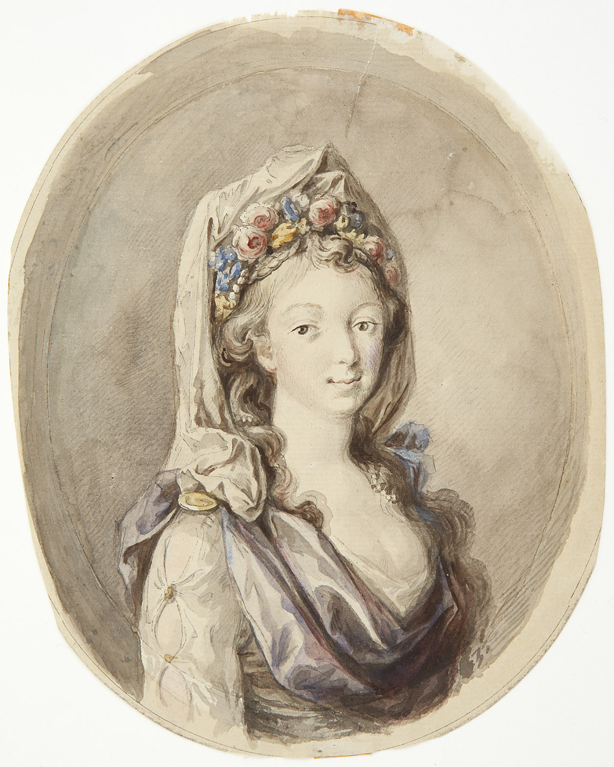Uno de estos marcos es un rico ejemplar del siglo XVII con estructura de madera de pino cubierta con placas de concha de tortuga carey (Eretmochelys imbricata) y molduras de ébano talladas con relieves de ondas dispuestas en el filo y el canto (fig. 1). El marco, que conserva también su trasera original de madera, está siglado en el reverso de la moldura y en la trasera con el número de inventario “4027” (también lo estuvo, hasta su reciente limpieza, sobre el carey). Este número corresponde en el inventario del Museo —realizado por Emilio Camps Cazorla entre 1948 y 1950— a un dibujo de Luis Paret (1746-1799) que representa a su esposa, María de las Nieves Fourdinier (fig. 2). La trasera del marco tiene además una etiqueta de papel de la Junta de Incautación con el número “446”, que en el listado de obras incautadas a José Lázaro para su protección al inicio de la Guerra Civil se describe como “acuarela / busto de dama / 26 x 20”, y se corresponde con el dibujo de Paret (fig. 3). Además de esto, lo más importante es que en el anverso de la trasera se conserva encolado un grabado de Pierre de Loisy (1619-1670) estampado sobre tela con la representación del Santo Sudario de Besançon, una famosa reliquia destruida en 1794 (fig. 4).
