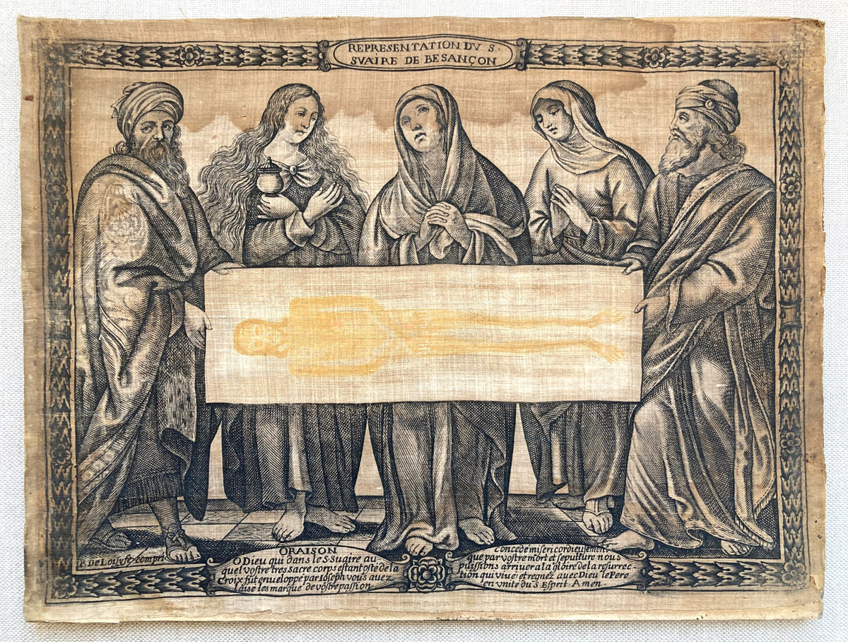 La estampa representa el santo sudario o sábana santa de Besançon (Francia) extendido y sostenido en alto por José de Arimatea y Nicodemo, quienes lo muestran al público como solía hacerse en los días señalados en los que se exhibía la reliquia. Detrás de la sábana, que muestra la impronta frontal en ocre del cuerpo muerto de Cristo, se disponen las figuras dolientes de la Virgen, María Magdalena y María de Cleofás. Arriba, cartela con el título de la obra: “REPRESENTATION DU S. / SUAIRE DE BESANÇON”. Abajo, en sendas cartelas, la oración dedicada al santo sudario (“ORAISON / O Dieu qui dans le S. Suaire au-/quel vostre tres sacre corps estant osté de la / croix fut enuel oppé par Ioseph vous auez / laisé les marque de vostre passion”) y la indulgencia concedida por Clemente VIII (“concedé misericordieusement / que par vostre mort et sepulture nous / puissions arriver a la gloire de la resurrec/tion qui viue et regnez avec Dieu le Pere / en unité du S. Esprit. Amen”). La estampa, impresa sobre tela, aparece firmada por Pierre de Loisy en una reserva en la esquina inferior izquierda “P. De Loisy fe/compri.”