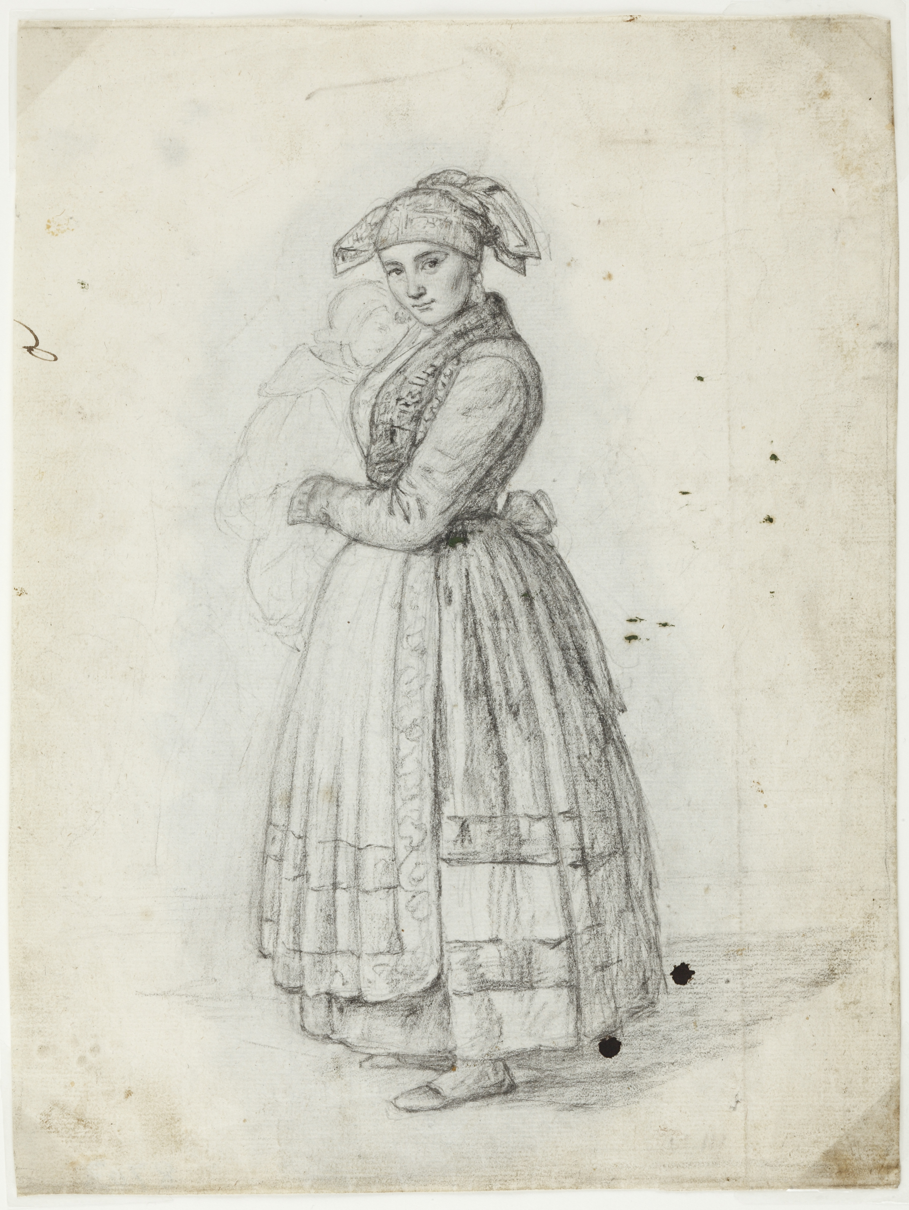 La primera mención de esta pintura se la debemos al escritor y crítico José Musso y Valiente (1785-1838), quien le dedicó una reseña muy favorable en la revista del Liceo Artístico y Literario (“La pasiega, cuadro pintado y litografiado por la señorita doña Rosario Weys”, El Liceo…, [1838], p. 100). Este número incluía como regalo la litografía de esta pintura, realizada también por Weiss (fig. 2). En su texto el autor destacaba la habilidad de la artista en el manejo del pincel, su originalidad y la falta de artificio en la representación del asunto, así como el trabajo delicado y exacto a la hora de llevar esta escena costumbrista a la piedra litográfica. Además de la pintura, ahora localizada, se conservan varios ejemplares de la litografía y dos dibujos, uno de ellos preparatorio de la primera, así como una versión posterior de parte de la figura, ambos en la colección del Museo (figs. 3 y 4). La litografía de La pasiega, además de mostrar la habilidad de su autora, tiene el valor de ser la única realizada por una mujer que apareció en la revista del Liceo. Según los estatutos de esta Institución, los miembros de la sección de pintura tenían —entre otras obligaciones—, que entregar una piedra litográfica en estado de estampación para reproducirla en su revista. El asunto elegido por Weiss, socia del Liceo con el número 221, tenía entonces cierta actualidad ya que las mujeres del valle del Pas se encontraban entre las más demandadas en la corte para trabajar como nodrizas; de hecho, el gentilicio pasiega llegó a ser sinónimo de ama de cría.