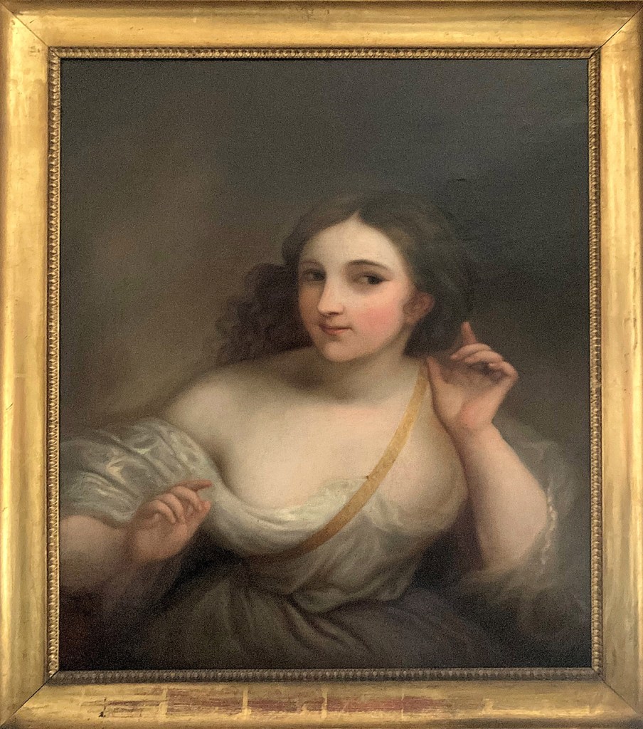 En el verano de 2023 se conoció que en la Colección Larriba (Madrid) se conservaba la segunda obra, una Alegoría de la atención, adquirida al año siguiente, en mayo de 2024, por el Museo del Prado (fig. 5). La pintura muestra a una sensual Diana cazadora, diosa de la caza identificada por la correa del carcaj para las flechas que cruza su pecho y por su actitud en estado de alerta, con la cabeza levemente ladeada y señalándose la oreja con el índice de la mano izquierda, al acecho de algún ruido que pudiera poner al descubierto una posible presa. El marco de época, moldurado y dorado, conserva en su trasera una etiqueta impresa en papel con el texto, “BARTOLOMÉ CAENLLA, / fabricante de Molduras y Marcos / dorados, calle del Arenal nº 4 / MADRID”, un enmarcador documentado en la capital entre 1833 y 1855. Este lienzo presenta la particularidad de tener sobre el barniz original, en la esquina inferior izquierda, una firma apócrifa, “J C Brochart”. Se trata de un pintor francés (1816-1899) dedicado casi en exclusiva al retrato femenino de busto —a menudo en ambientes o con indumentaria oriental—, de técnica académica, dibujo muy marcado y un carácter decorativo, diferentes a la técnica, espíritu y estilo de esta pintura documentada y segura de Rosario Weiss.