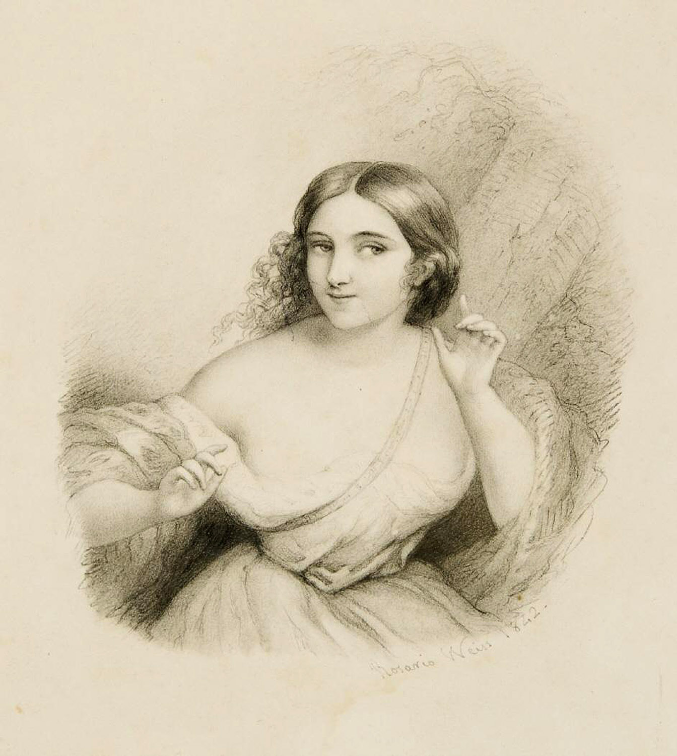 La pintura es muy representativa de la técnica y estilo que la artista desarrolló durante su breve etapa profesional (desde su regreso a Madrid en 1833 hasta su fallecimiento en 1843), y resulta muy cercana al Ángel custodio, una obra firmada y fechada en 1841 (fig. 7). Aunque el lienzo de la Alegoría de la Atención no está fechado (¿quizá la firma apócrifa oculte la fecha y firma de Weiss?), lo más probable es que se hubiera realizado también en 1840, año en el que firmó la Alegoría del silencio con el que formaba pareja. Esta obra fue descrita como un autorretrato en el catálogo del Museo de Burdeos redactado en 1856 por Jules Delpit y Pierre Lacour, profesor de la joven Rosario en la escuela local de dibujo y pintura: “busto de perfil girado a la derecha, haciendo el gesto del silencio, en el que la artista se ha representado de un modo muy parecido” (Pierre Lacour y Jules Delpit, Catalogue des tableaux, statues, etc. du Musée de la Ville de Bordeaux, Burdeos, 1856, nº 441). Laurent Matheron, quien vio esta pintura en Burdeos, la describió con detalle en 1858 como un autorretrato firmado y fechado en 1840, año en el que Rosario Weiss fue nombrada académica de mérito por la Pintura de Historia de la Real Academia de Bellas Artes de San Fernando (Laurent Matheron, Goya, París, 1858; edición en español: Goya, Madrid, 1890, p. 112). Pese al alto grado de idealización de la figura femenina protagonista de esta pintura que ahora se da a conocer, modelo que se repite en el dibujo fechado en 1842, en ambas se pueden identificar los rasgos de su autora, presentes en otros autorretratos seguros de su catálogo: rostro menudo de nariz recta, boca pequeña, ojos grandes y cabello oscuro. Solo dos años después de pintar esta Alegoría de la Atención, el 18 de enero de 1842, Weiss fue nombrada maestra de dibujo de Isabel II y de su hermana, la infanta Luisa Fernanda, empleo de prestigio que desempeñó poco tiempo pues murió de cólera el 31 de julio de 1843, en su mejor momento profesional.