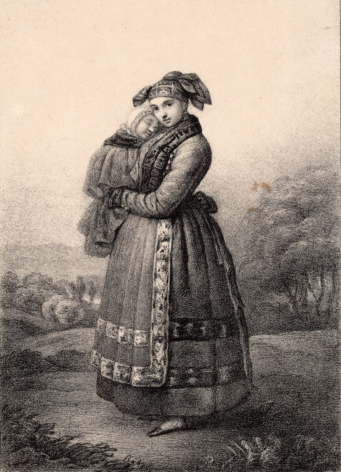En enero de 2020 se conoció que en una colección particular de Alicante se conservaba, aunque en estado precario, La pasiega, un pequeño óleo sobre lienzo firmado “R. Weiss” y fechado en 1835 (fig. 1). La pintura, en trámite de ser adquirida por el Ministerio de Cultura para la colección del Museo Nacional del Romanticismo, representa a una joven nodriza sosteniendo un bebé en sus brazos sobre un fondo de paisaje montañoso. Es una figura de cuerpo entero que muestra a la joven con gesto resuelto mirando hacia el espectador. Destaca su vistosa indumentaria tradicional, característica del valle del Pas (Cantabria), procedencia habitual y preferida para las amas de cría: cabello recogido bajo un pañuelo estampado y anudado en alto, chaquetilla ajustada (presumiblemente sobre camisa y corpiño) y falda o manteo con dos anchas cenefas horizontales. Sobre la falda luce un elaborado delantal y, en su oreja izquierda, un zarcillo de oro. Sobre el pecho parece adivinarse un collar de cuentas de coral rojo, considerado un elemento protector que además procuraba buena suerte. Los zapatos, característicos de la década de los años treinta del siglo XIX, son propios del entorno urbano en el que las nodrizas solían desempeñar su trabajo. El niño lleva un gorro de tela blanca ribeteado y se abriga con una rica capa de paño con cuello de piel.