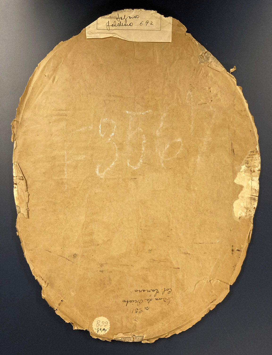 El retrato está firmado y fechado a tinta en el lateral derecho (“E. Fechner 1833”), con la grafía y el formato más habitual utilizado por este artista alemán que, sin embargo, desarrolló su carrera profesional en Francia (fig. 2). El dibujo estuvo enmarcado y conserva en la trasera de cartón de ese montaje un fragmento de una etiqueta numerada (692) de la Junta de Incautación y Protección del Patrimonio Artístico, que indica que la obra se retiró de Parque Florido, el actual Museo Lázaro Galdiano, para su protección durante la Guerra Civil —junto al resto de la colección— y con ese mismo número se describe en el acta redactada al efecto el 24 de septiembre de 1936 (fig. 3). Esta trasera conserva también otra etiqueta de papel de menor tamaño con dos números, “446 / 668”. El primero podría ser un registro de la galería o casa de subastas en la que se vendió la obra. El segundo número corresponde al que se asignó a este dibujo en el catálogo de la exposición Miniatura-retrato en España (Madrid, 1916) donde se describe así: “FECHOSER (E.) [sic] / 668. La señora del diplomático Prieto. / sobre papel / Firmada y fechada 1833 / Señora de Lázaro”. Para aquella importante muestra, organizada por la Sociedad Española de Amigos del Arte —de la que José Lázaro era socio—, la familia Lázaro-Florido prestó 20 obras. Respecto a la identidad de la retratada, “la esposa del diplomático Prieto”, poco se ha podido averiguar ya que este apellido no coincide con el de ningún embajador español en 1833, aunque bien podría tratarse de cualquier otro cargo, oficial u honorario, como agregado o cónsul, ya fuera en París o en alguna otra ciudad. Por tanto, es probable que la modelo —por ahora sin nombre propio— pudiera posar en París para el artista alemán. Su retrato, muchos años después, terminó siendo adquirido por José Lázaro Galdiano (1862-1947), muy posiblemente en esta misma ciudad, en la que residió largas temporadas y a la que acudía de forma habitual para ampliar su colección.