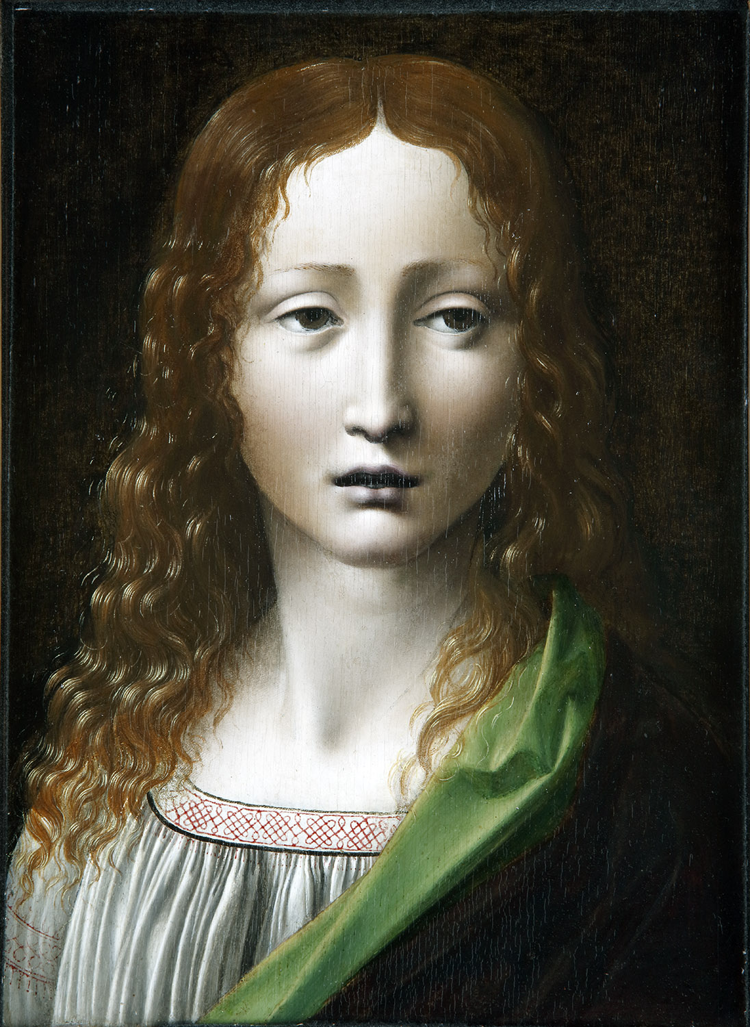 En cuanto al autor de la obra, las opiniones de la crítica han sido también muy variadas. La atribución al propio Leonardo –salvo Mayer que en 1910 se refirió a “la insólita cabeza leonardesca de Cristo joven, cuya carnación esmaltada de claros tonos purpúreos recuerda a las obras de la escuela francesa”– fue solo defendida en España: por Camón Aznar, Perera, Gaya Nuño y por el autor de estas líneas en un artículo juvenil de 1981. Posteriormente, Ruiz Manero se inclinó por Ambrogio de Predis, Pérez Sánchez lo relacionó con el Maestro de la Pala Sforzesca y yo mismo, en 2004, lo asigné a Giovanni Antonio Boltraffio. Por su parte, los especialistas extranjeros han adjudicado la tabla a diversos artistas del entorno leonardesco: Ambrogio de Predis (Berenson, Brown y Fiorio), el Pseudo-Boltraffio (Romano y Marani), Boltraffio (Castelfranchi Vegas y Ballarin) y Marco d’Oggiono (Baudequin). En los catálogos de las exposiciones en que ha figurado, todas ellas bastante recientes, Marani (Florencia, 2005-2006) lo atribuyó a un pintor milanés próximo a Leonardo, Danieli (Mantua, 2006-2007) a un artista lombardo cercano a Boltraffio, y Mazzotta (Londres, 2011-2012) a Marco d’Oggiono.
